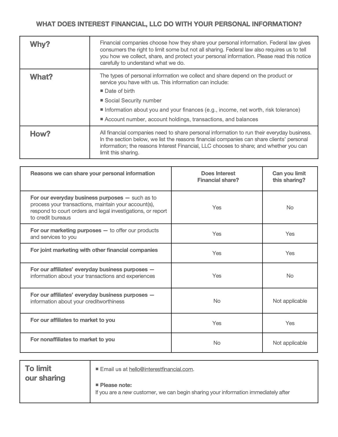 In connection with Membership Benefits, educational tools, eligibility screening, and account assistance services, we may also share your information with: affiliates, including Interest Financial; service providers and vendors that support our operations; financial institutions, custodians, broker dealers, banks, and account providers; program administrators and partners; and marketing, analytics, and advertising partners. We may share information with third parties in order to facilitate account opening, application submission, or account related workflows; present offers, referrals, or opportunities; and enable services you request or direct us to provide.
