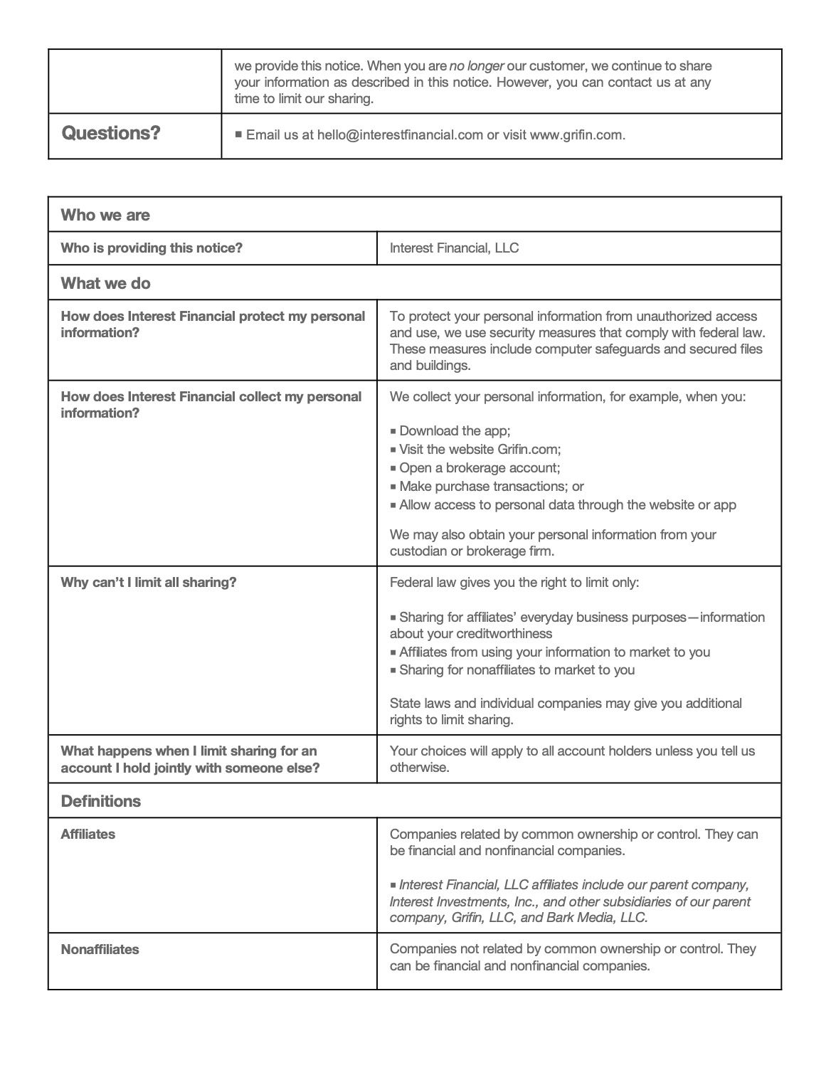 If you have any questions about our Privacy Policy, for purposes of the Grifin Platform, please contact Grifin Customer Service at: hello@grifin.com.If you have any questions regarding the requirement to maintain certain information as required by law please contact us at hello@interestfinancial.com.